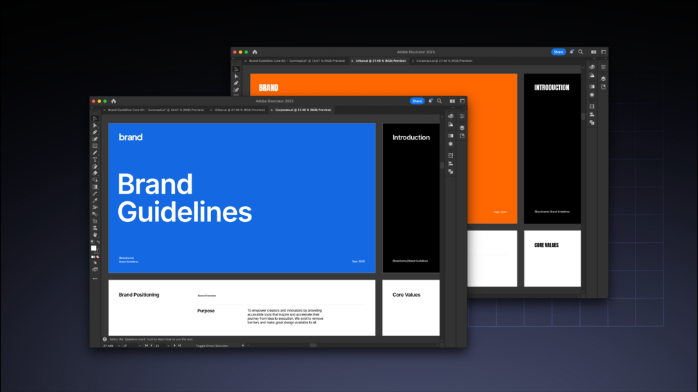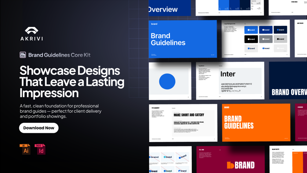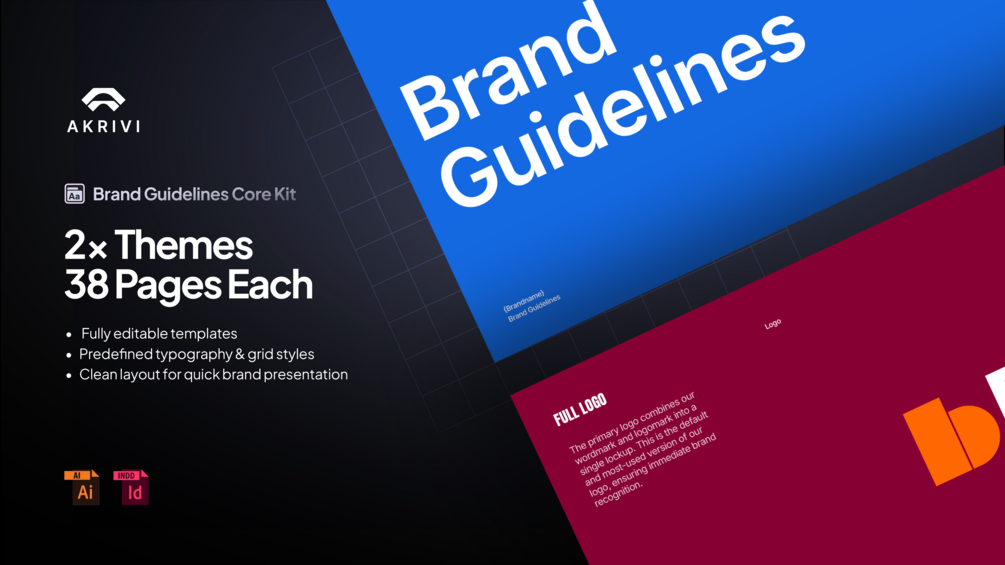 It includes everything you need to create structured, client-ready brand guidelines in Illustrator or InDesign — no more messy handoffs or missing sections.