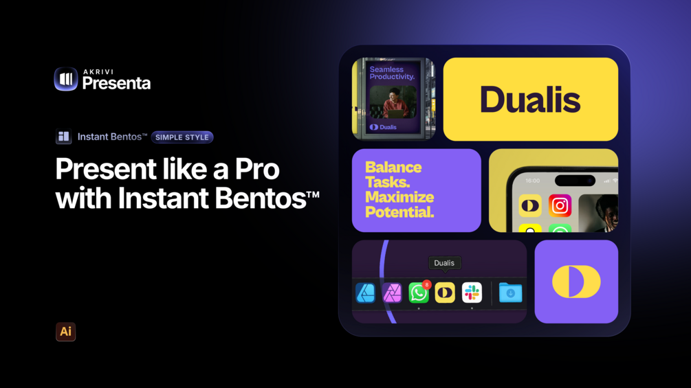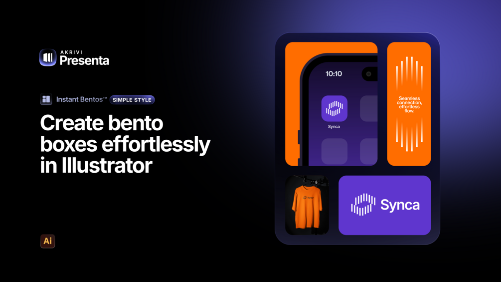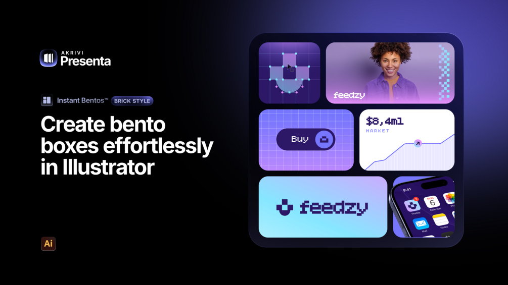 Unlock advanced customization, 4 unique layout styles, and full control with Presenta™ Bento Generator — our complete bento layout tool for Adobe Illustrator.